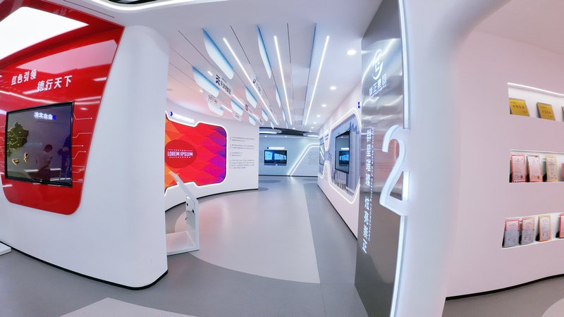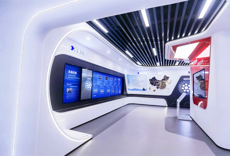 展廳中多處運用電子互動大屏放映企業專題片,并且將展廳墻體直角部分改為弧形,與曲面屏呼應的同時增強了空間的整體流動性。展廳運用統一基礎標準色調,使得整個展廳風格更加統一。在頂部運用線性燈與筒燈進行融合照明,提升視覺美感。